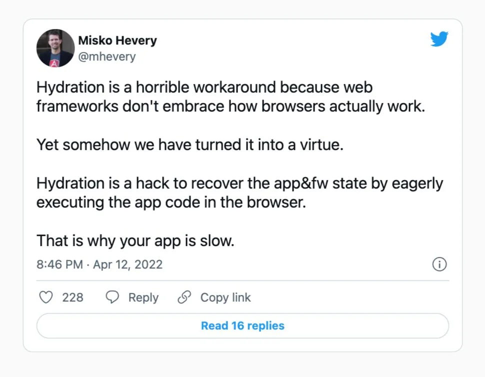 Qwik allows you to not do hydration, they argue that hydration is a hack to recover the APP_STATE and FRAMEWORK_STATE by eagerly executing the app code in the browser. This involves: