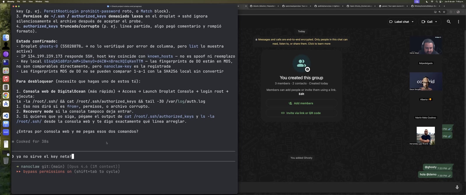 A mitad del taller el droplet donde corría Ghosty dejó de aceptar la llave SSH. Lo dejé en vivo porque este tipo de cosas es exactamente lo que aprendes operando infra tuya: